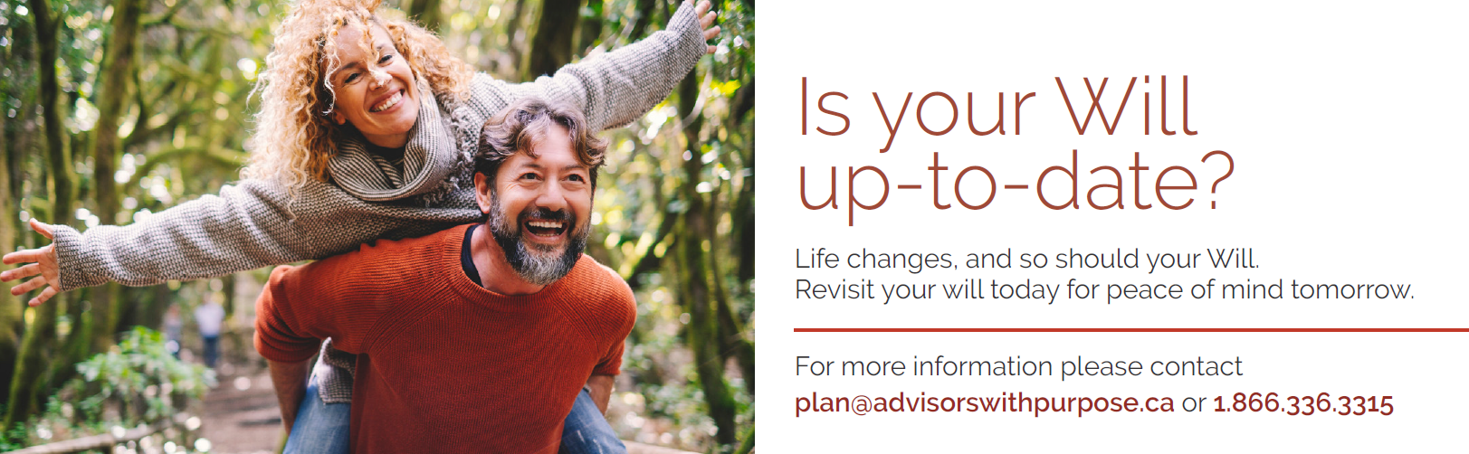 Please note that CCMBC Legacy Fund is not reinstating the Will program previously offered by Stewardship Ministries. Advisors with Purpose is here to assist you in making decisions about your will, however the will itself must be created with your lawyer. If you do not have an estate lawyer, Advisors with Purpose can connect you with one in your area. Please contact Advisors with Purpose to learn more.